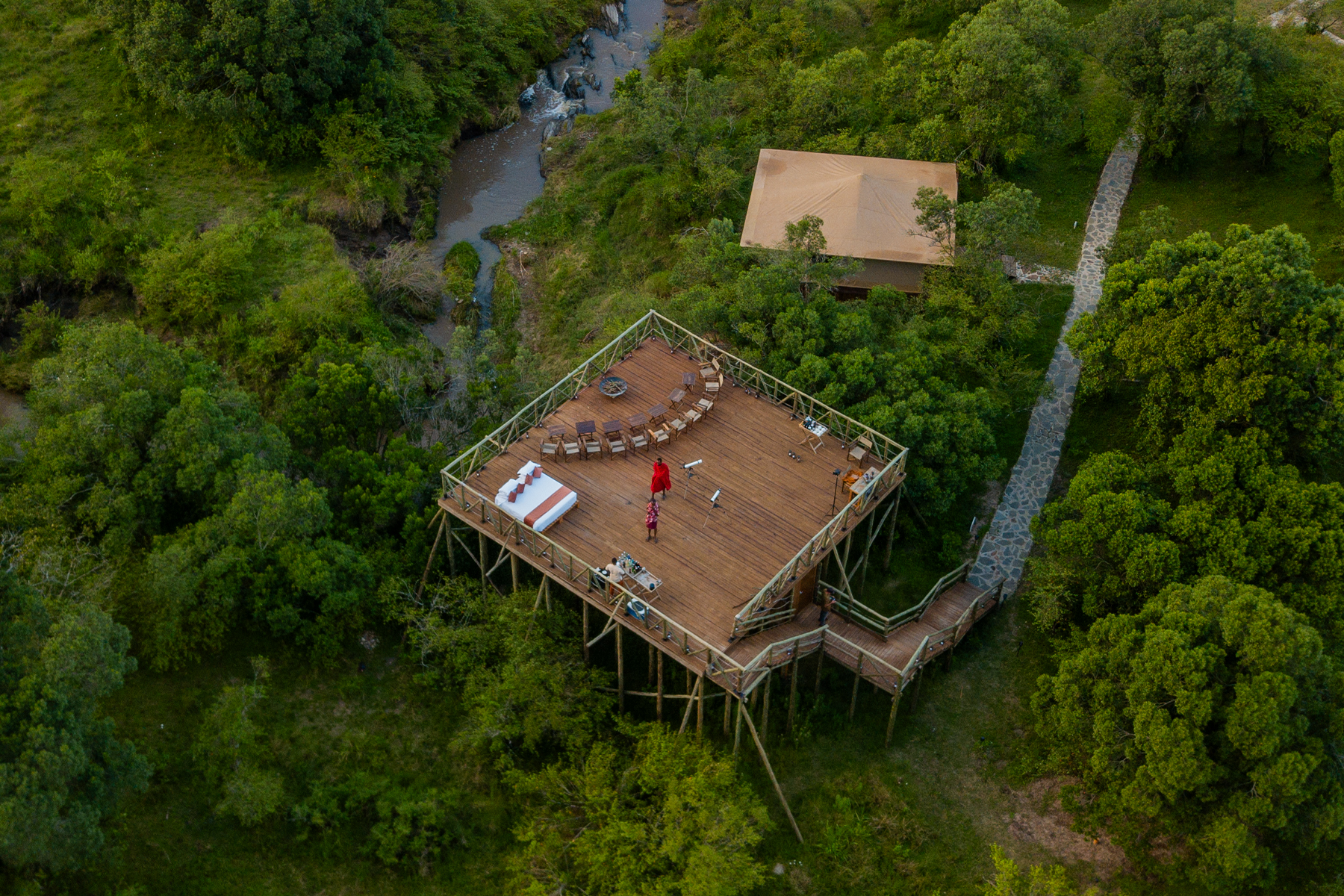 At night, sleep under the stars on the sky deck in our Star Bed — your own corner of the Mara, with just stars above and the sounds of the wild all around.